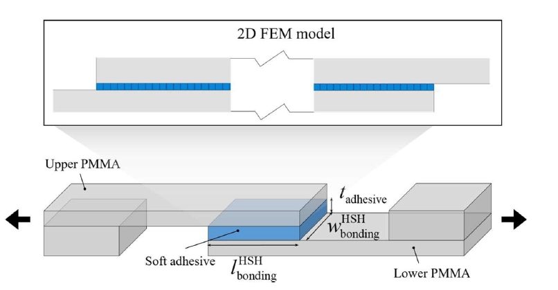 采用3M雙面膠帶(厚度0.06 mm)作為軟膠粘材料,PMMA作為硬基體與被粘體。通過單搭接剪切試驗(yàn)(單調(diào)加載、恒力保持、位移保持)驗(yàn)證含時(shí)CZM的準(zhǔn)確性。有限元模擬采用Abaqus實(shí)現(xiàn),膠粘層用CZM描述,PMMA設(shè)為剛體。結(jié)果表明,CZM能準(zhǔn)確捕捉不同加載速率下的峰值力與失效能,且能模擬恒力下的蠕變失效過程。在HSH位移保持實(shí)驗(yàn)中,未觀察到延遲失效,因膠層受均勻約束。