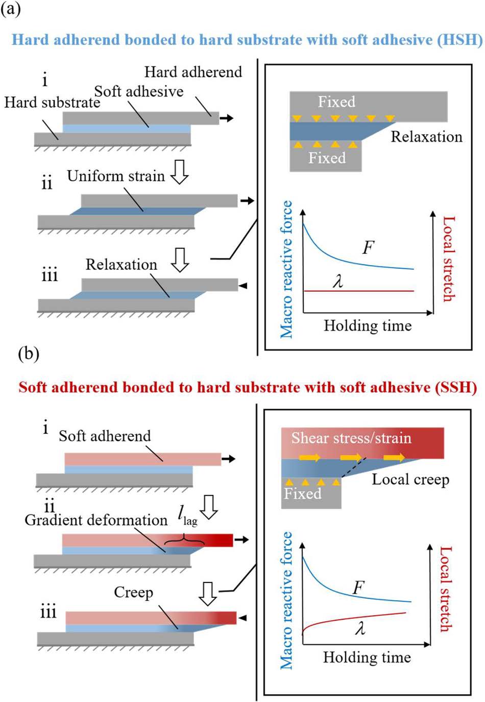 與傳統(tǒng)硬膠粘結(jié)構(gòu)不同,軟膠粘結(jié)構(gòu)(如水凝膠、壓敏膠)具有大變形回復(fù)與能量耗散能力,廣泛應(yīng)用于軟體驅(qū)動(dòng)器、超級(jí)電容器、應(yīng)變傳感器及組織修復(fù)等領(lǐng)域。此類結(jié)構(gòu)常面臨沖擊、剝離、循環(huán)拉伸等載荷,當(dāng)達(dá)到特定載荷水平后可能進(jìn)入剪切位移保持狀態(tài)(如體內(nèi)傳感貼片需長期附著)。延遲失效可分為恒力保持與位移保持兩類,現(xiàn)有研究多集中于恒力下的蠕變機(jī)制,而位移保持下無額外能量輸入?yún)s發(fā)生延遲失效的反常現(xiàn)象機(jī)制尚待揭示。