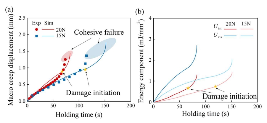 研究表明,在位移保持過程中,盡管整體結(jié)構(gòu)宏觀力松弛,但SSH中裂紋前沿的軟膠粘因局部應(yīng)力集中發(fā)生蠕變變形,持續(xù)積累內(nèi)稟應(yīng)變能,直至達(dá)到臨界值引發(fā)失效。這源于軟被粘體儲(chǔ)存的彈性應(yīng)變能釋放,驅(qū)動(dòng)膠粘層局部蠕變。