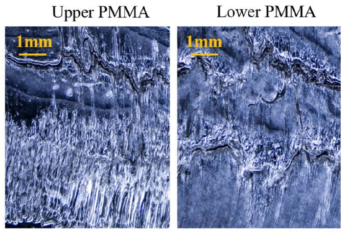 SSH試樣以PDMS為被粘體,通過粒子追蹤法原位觀測變形場。發(fā)現(xiàn)位移保持過程中,PDMS的剪切滯后長度隨時(shí)間增加(因膠粘模量粘彈性下降),整體結(jié)構(gòu)呈宏觀松弛。同時(shí),裂紋前沿膠粘局部伸長持續(xù)增加,表現(xiàn)出明顯蠕變行為,最終引發(fā)脫粘。能量分析顯示,局部膠粘的內(nèi)稟應(yīng)變能在蠕變中積累至臨界值,導(dǎo)致失效。